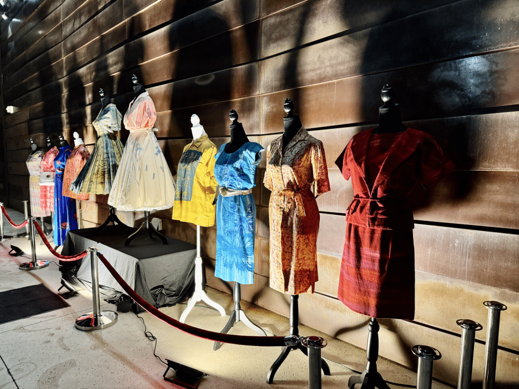 From his personal collection, archivist Robert Black provided the event with a 10-piece showcase of original Lloyd Kiva New designs that were displayed on mannequins behind a wall of stanchions for the attendees to admire and examine up close.