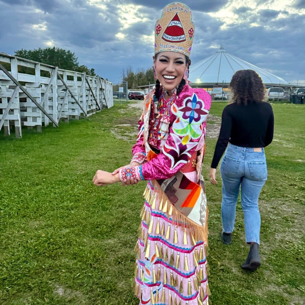 On Instagram, we are reminded of Ashley’s beauty, elegance, and dedication to her people and her culture. @MissUniverseCanada collaborated on a post featuring clips of Ashley Callingbull at pow-wows, hosting televised programs, and competing in previous pageants. The beautiful video includes “Braids” by Anachnid, a multidisciplinary Indigenous Oji-Cree artist based in Montreal.