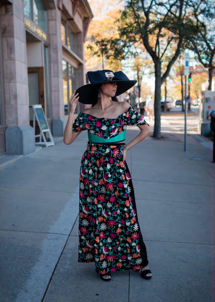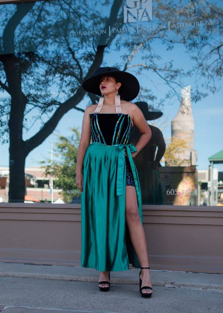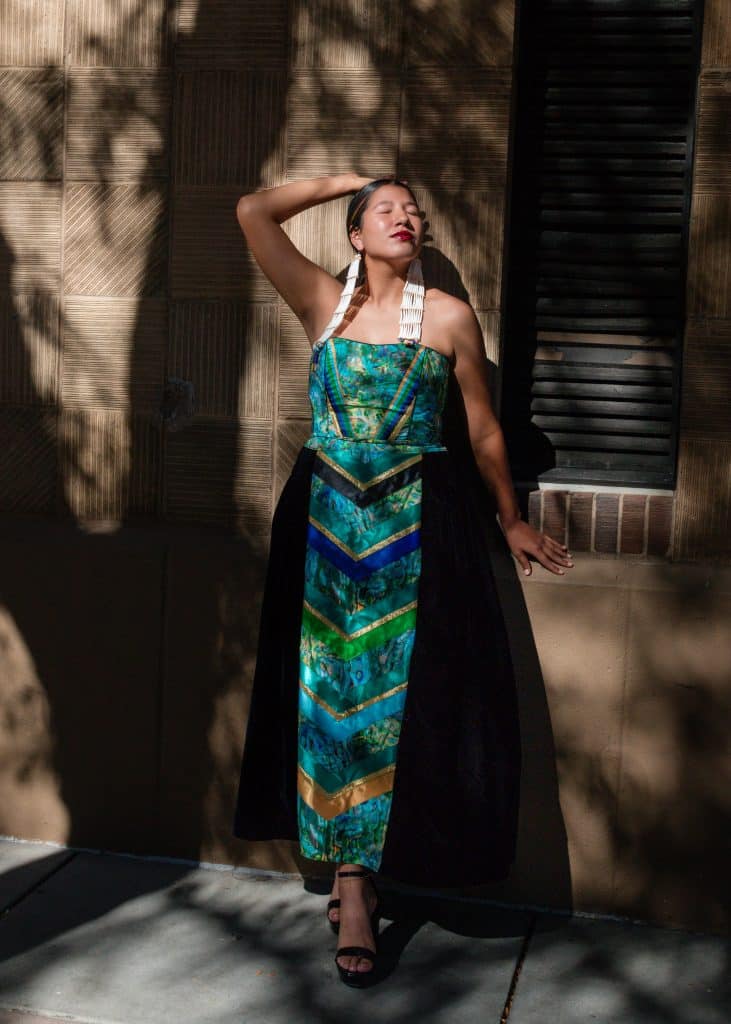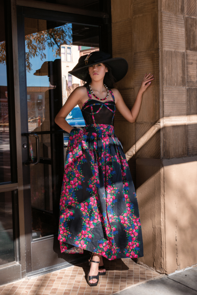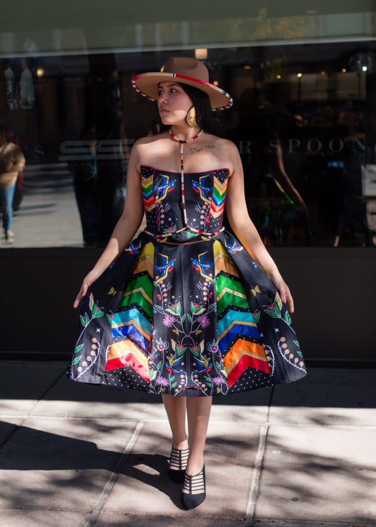 “Indigi-Kokum Queen dress– My Indigenous version of a vintage Audrey Hepburn look. I wanted to create a chic formal corset outfit to complement the Kokum fabric. Each piece can be worn separately.