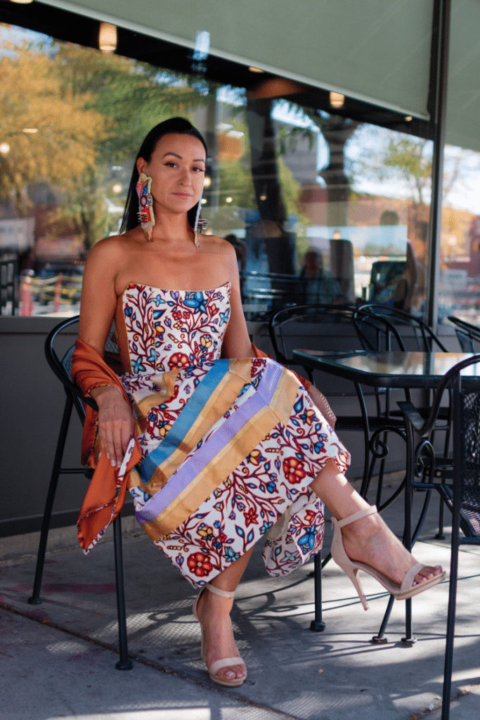 Diné fashion designer Michelle Luna creates her unique designs by hand. Most recently, she designed a two-piece dress that featured a red velvet skirt and corset embellished with dentalium shells for Native actress Paulina Alexis (Reservation Dogs).