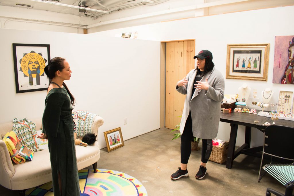 After roaming around downtown L.A. for a bit, we stopped into Bethany’s swanky white-walled yet vibrant studio. Her walls lined with Native-designed wall art prints while Native jewelry and accessories dotted her tables. Let’s just say, her studio is #decorgoals.