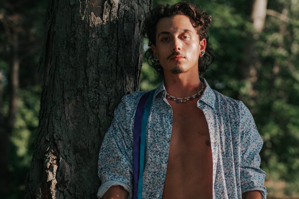 Diabo did this collaboration with photographer Samantha Wenniseriiostha Pepin, which had been a few months in the making. “She had reached out a few months ago to create something important, and what better way to show our support as allies to our two-spirit friends and family than by doing a shoot in Kahnesatake pines?”