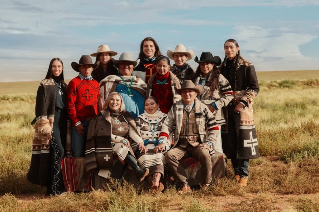 Contemporary adaptations of cherished Navajo symbols like spider woman and four directional crosses, Saltillo diamonds, and directional wedge weave motifs are incorporated throughout the collection, reflecting the tradition, innovation, and creativity present throughout Navajo culture. Standout pieces include woven jacquard blanket coats and wraps crafted with the natural colors of undyed wool alongside reinterpretations of Ralph Lauren styles like ranch coats and thicket jackets.