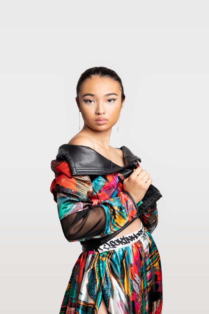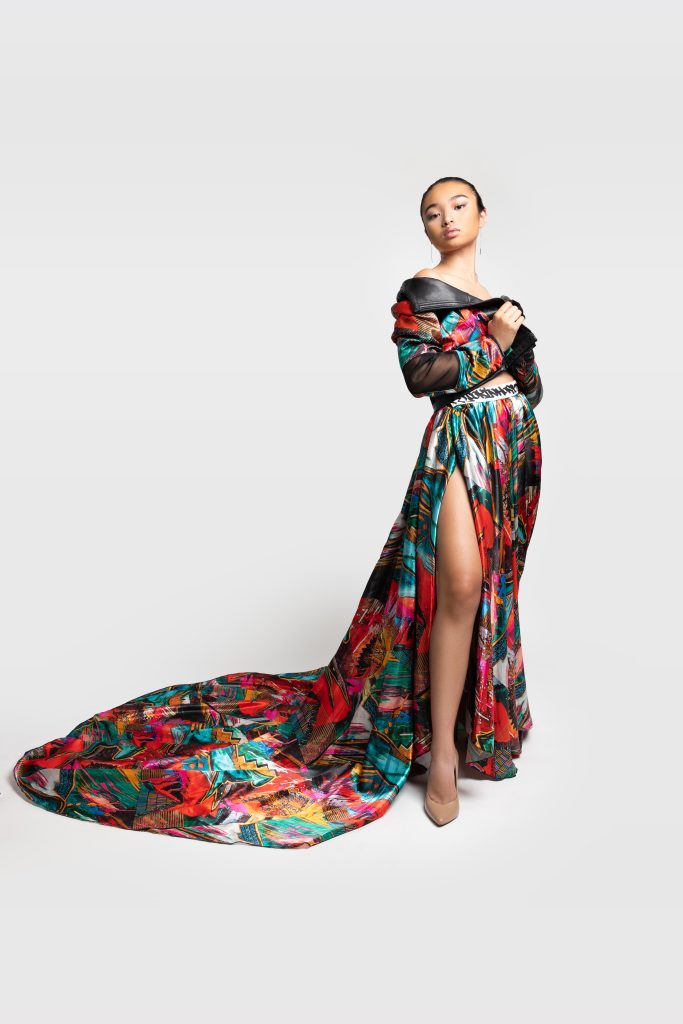 Designer Kayla Lookinghorse-Smith, Hunkpapa Lakota, and a member of the Standing Rock Sioux Tribe is certainly a force to be reckoned with at the highly-competitive showcase. The namesake brand was created to bring authentic Indigenous design to the new fashion market where traditional patterns meet high fashion and reclaim traditional artisan work. As an influential Indigenous clothing brand on a global platform, it naturally empowers women through its timeless designed clothing.