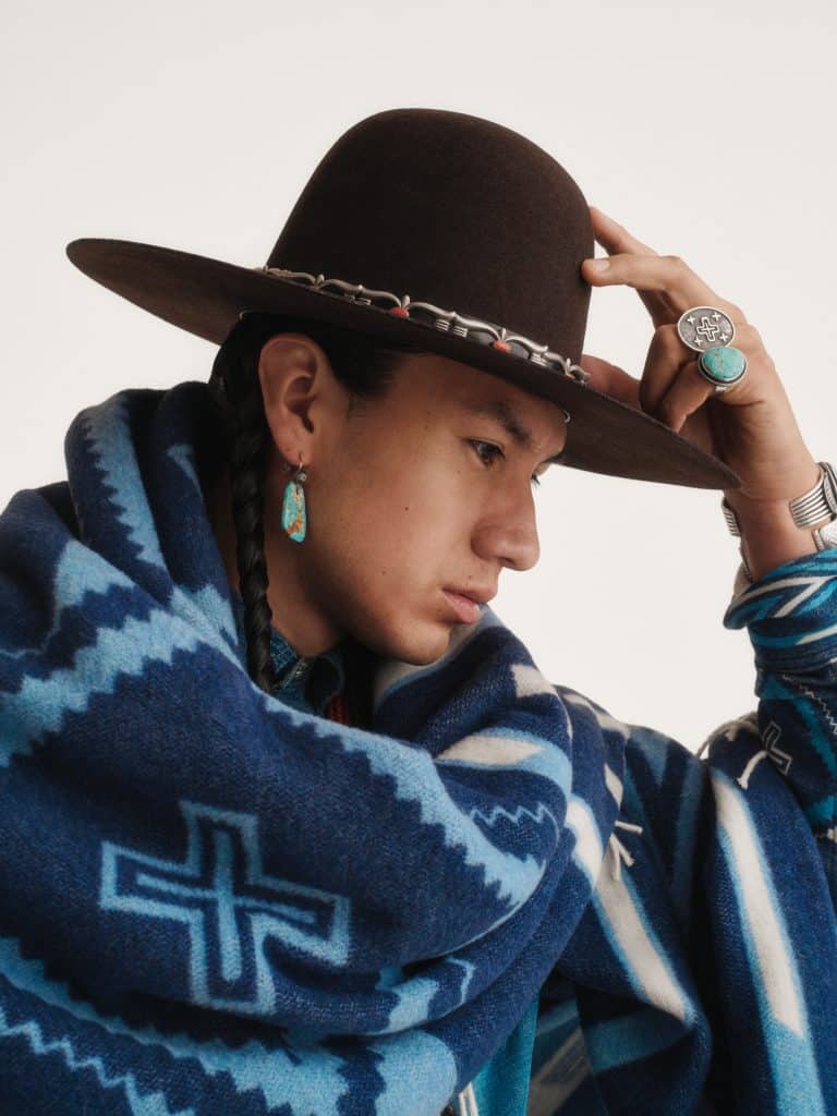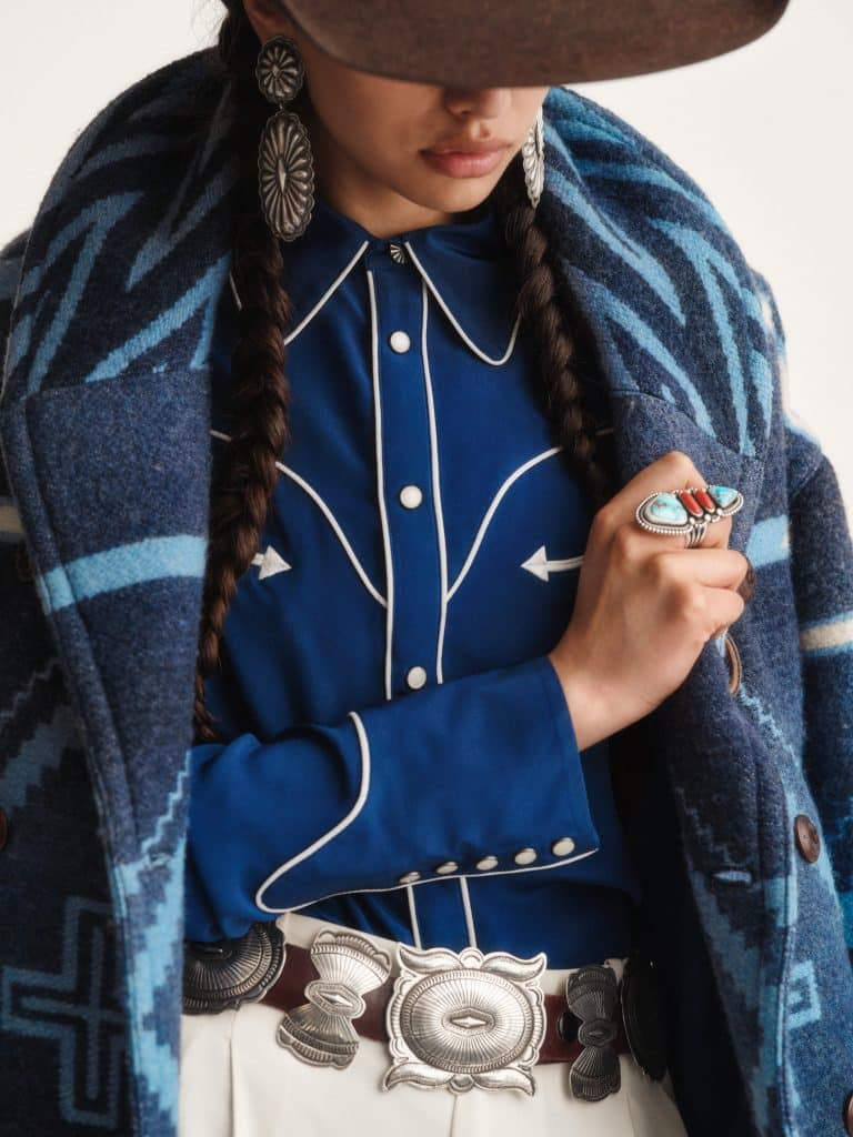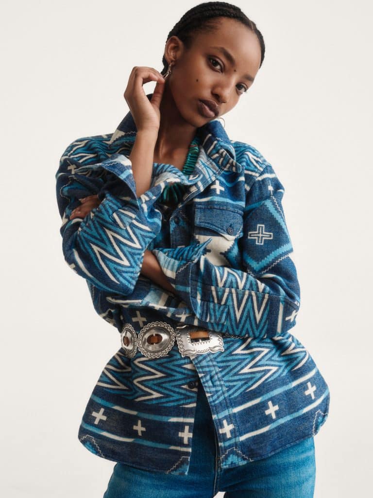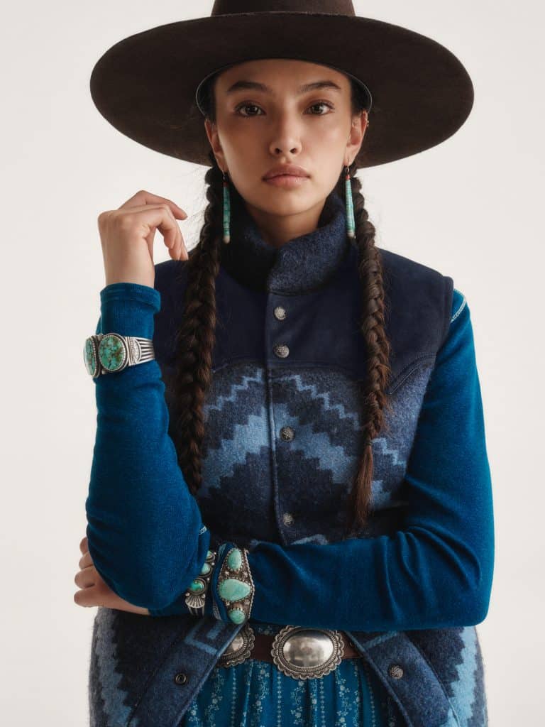 This assortment includes 27 men’s, women’s, and unisex apparel and accessories featuring traditional Navajo elements like four-directional crosses and wedge weave motifs. Standout pieces include a beautiful indigo-hued jacket inspired by Rodeo trophy jackets, a down vest with throughout suede yokes based on the typical dress of the men in Naiomi’s family, and a beautiful silk western shirt with contrast piping, pearlized snaps, and a concho button – a thoughtful nod to Naiomi’s family ranching heritage. Many pieces in the collection are crafted with a beautiful and rugged throughout suede – a nostalgic fabrication for Glasses, who grew up with a saddle with roughout suede trim.