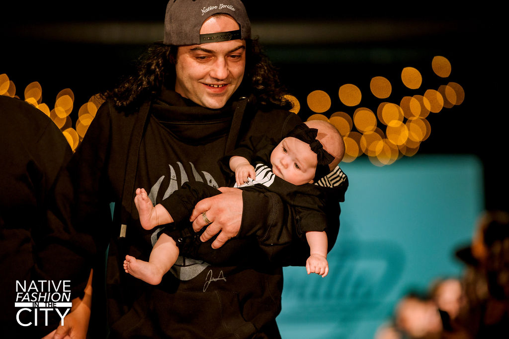 Next on the runway was Native Gorilla, a Lakota streetwear brand with a variety of printed t-shirts, sweatshirts, and tank tops. One of the more noticeable designs was the “No More Sisters” print featured on multiple items, referring to the MMIW issue in the Indigenous community. Paired with Native Gorilla was Teton Trade Cloth, a fashion brand made up of members of several Indigenous nations, who offered up some accessories for the show. The brand was worn by many of the youth models that night, quite literally so, as, at the end of their collection, the owners came out with their baby in some of their merchandise, much to the crowd’s enjoyment. In a conversation I had with Lakota Sage, one of the owners of Native Gorilla, he spoke about some of the inspirations behind their work that night: “This is my first baby, the first grandbaby on both sides of the family, and I think it was like a family inspiration this year.” That essence of the family was clearly seen in their collection, their brand catering to people of all ages and body types, providing affordable streetwear clothes for the Indigenous community.
