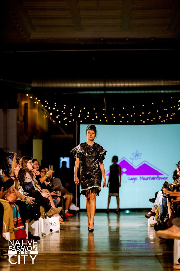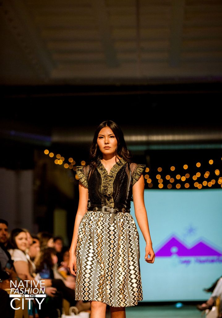 Excited whispers echoed throughout the third floor of the McNichols building on March 18th in downtown Denver, accompanied by the reverb of spinning music. Bright spotlights shone down the runway as conversations simmered down and the MC of the night, Joshua Emerson, welcomed the crowd to the seventh annual Native Fashion in the City. A professional comedian, Emerson kept the event lively and playful with some comedy and give-aways, before introducing the host of the fashion show, Kelly Holmes. Holmes reminisced about the trials and tribulations of the past few years, noting those that the community had lost, as well as how much the show has meant to both the designers and models since its inception.