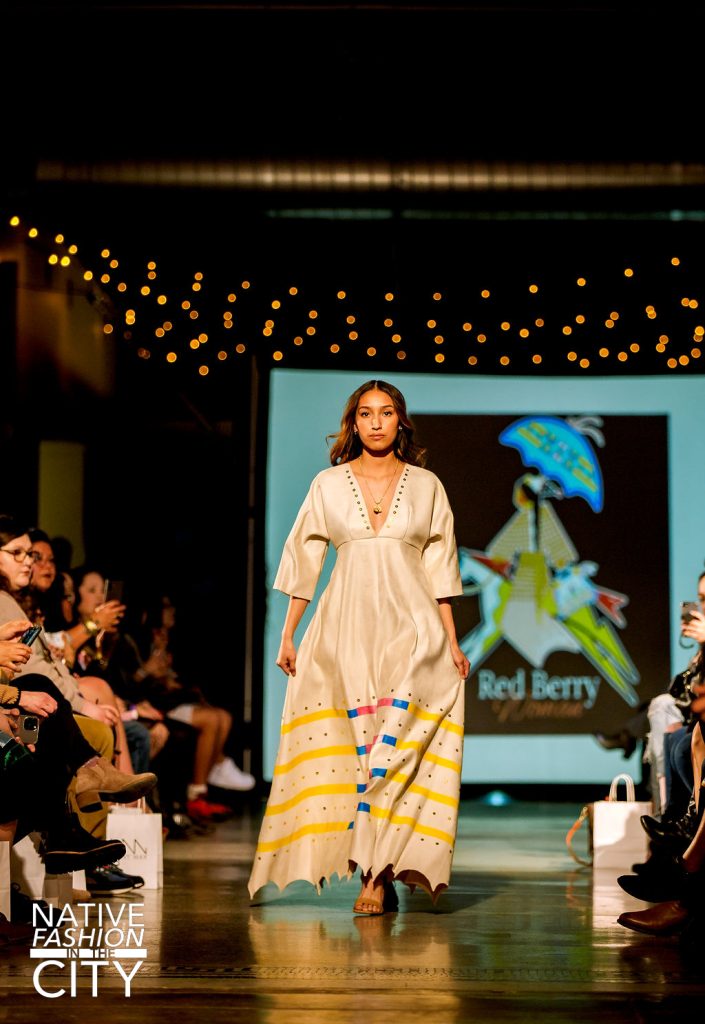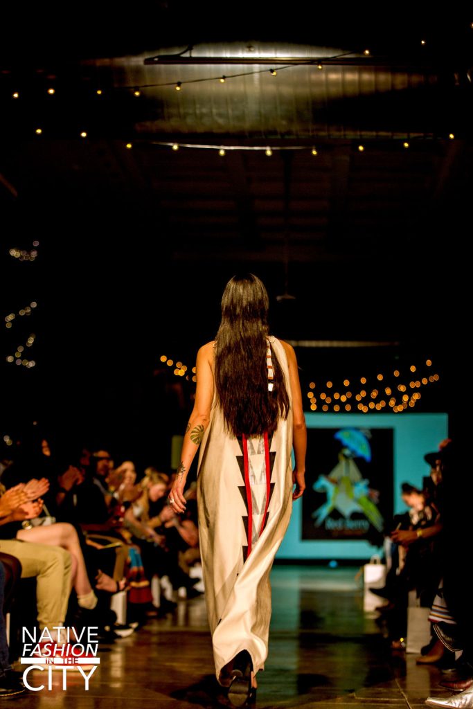 After that, the next designer to present their work was Red Berry Woman, a line created by Norma Baker-Flying Horse (Hidatsa, Dakota, and Assiniboine). The collection made great use of brown and white fabrics for the dresses and was often paired with beautiful belts that easily caught the guest’s attention. Many of the pieces had brightly colored patterns around the bottom or running down the center, leading the eye to appreciate the outfits as a whole. In the end, when the designer herself walked out with her models, the crowd was just as excited to see her in her own spectacular outfit, strutting confidently down the runway.