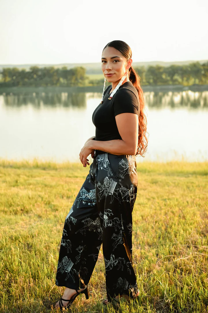 Lauren Good Day’s Traditions launched with a plethora of must haves in your wardrobe. This collection is “rooted in the aesthetics of traditional Native women’s dresses.” It celebrates “the adornment of heritage on new silhouettes with ledger art inspirations.” The Native Max staff pick was undoubtedly the Ledger Horses Pants, serving class and culture in every step. The heat waves are not ideal for tight pants and the “flowy loose style” is high fashion in comfort.