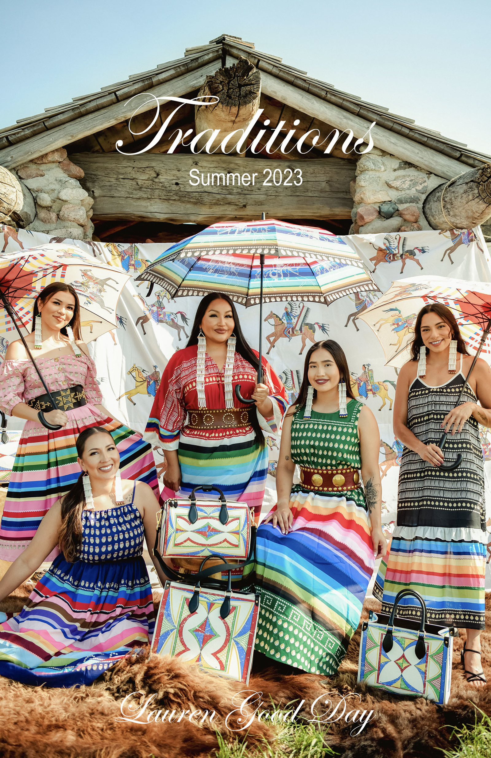 Speaking with Good Day on how she sparked inspiration to bring out Traditions for her Summer collection: “With every collection I do… I always start by thinking of a story I want to tell, a teaching that I want to share, or maybe even some history that I want to teach.” The Traditions collection has been very special to Good Day. This collection was inspired by the “Mandan/Hidatsa/Arikara ribbon dress.”