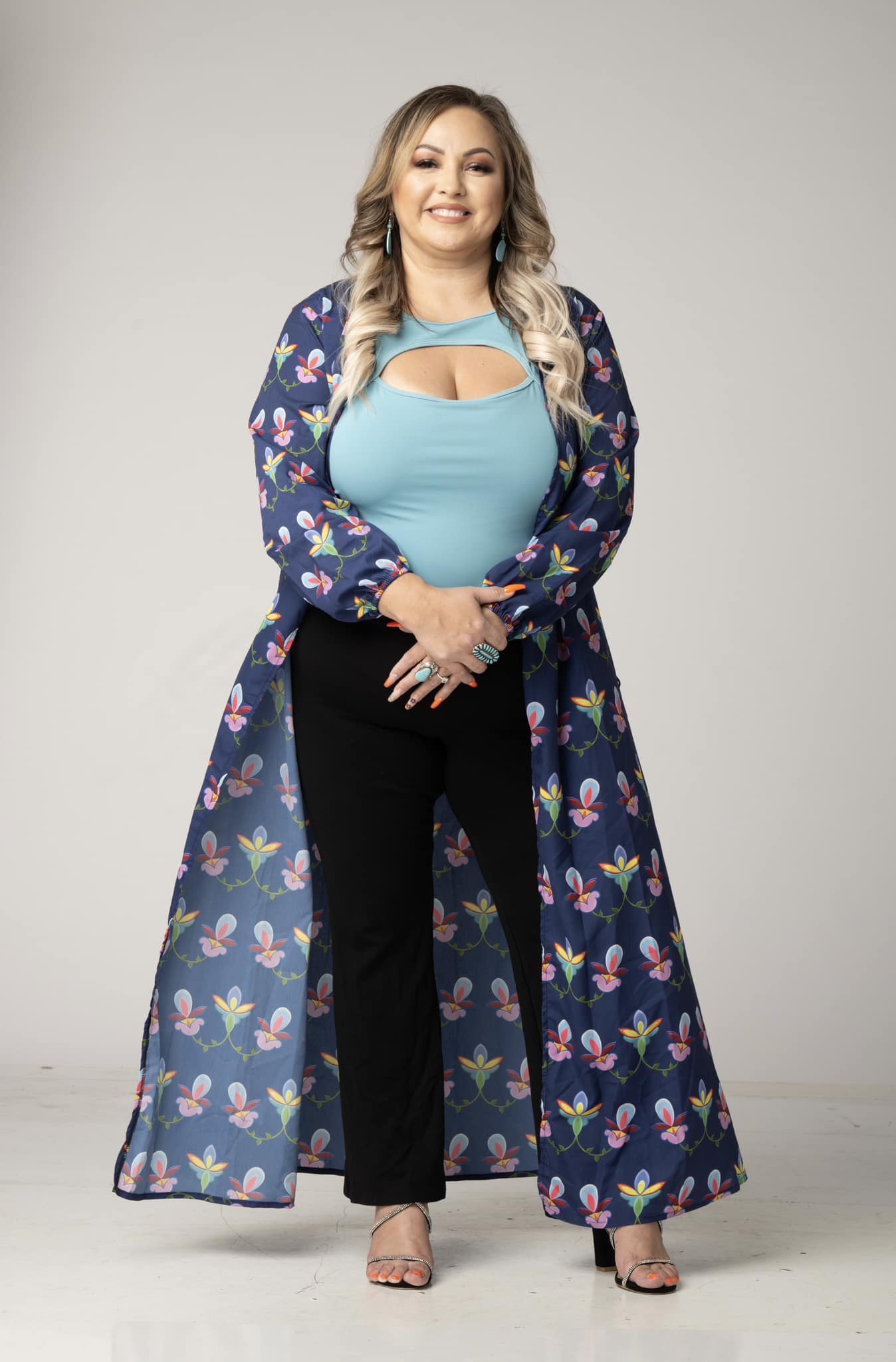 “When I wear my regalia and dance in the powwow circle, surrounded by prayers and the beat of the drum, I feel truly beautiful,” Large shared. It’s that same love for traditional dance and the beauty it brings out in people that Large put into the Nîpin collection. Particularly in how she believes “that fashion can be a powerful way to celebrate heritage, express identity, and resilience. “