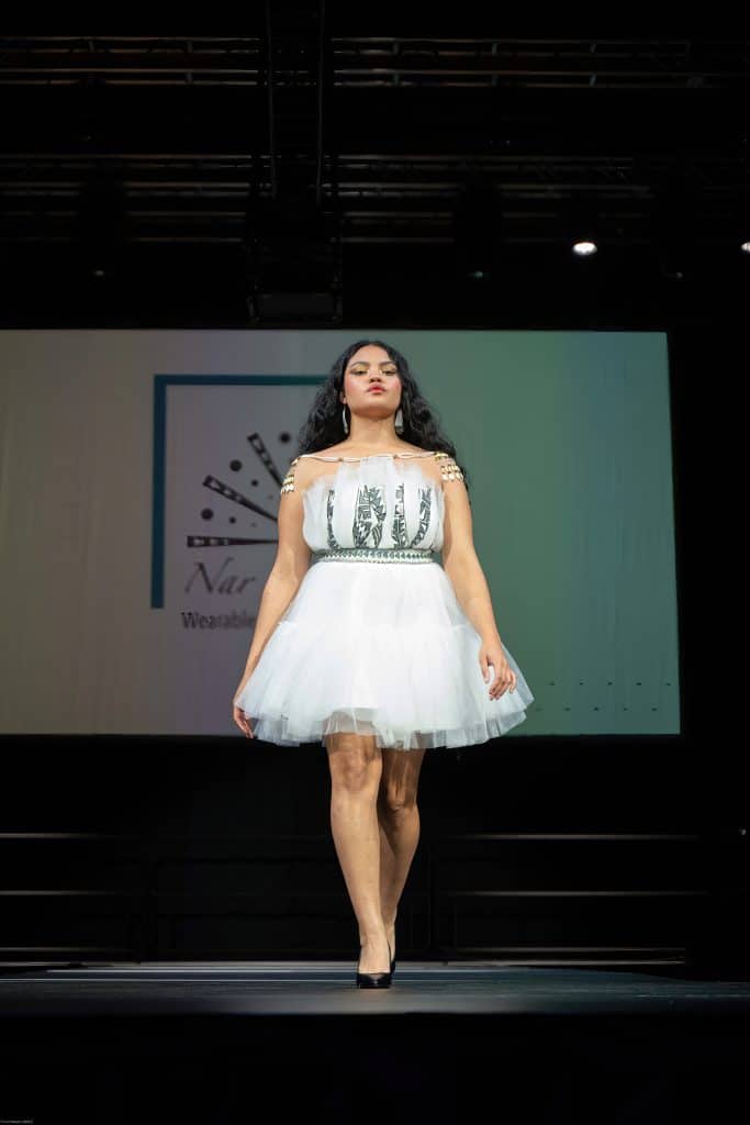 - Nar Rew Ekar shared her story and designs rooted in Yurok traditions, blending ceremonial regalia elements with wearable art for a one-of-a-kind showcase.