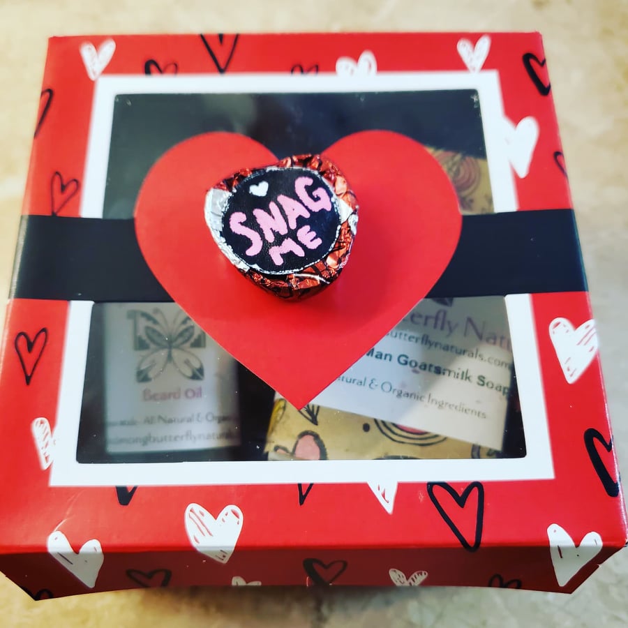The second set is a large black gift box with a Happy Valentine’s Day message, 1 large Peach Prosciutto body butter with real Champagne extract (which is healthy for the skin!), 1 heart-shaped Strawberry Champagne or Witchy Woman scented bath bomb, 1 large lip balm, and Pueblo Flirt message chocolates.